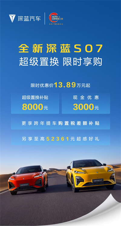 当前位置:大河车网 > 全新深蓝S07购车权益重磅升级政策窗口期抢占智能出行先机 作为新能源汽车市场的全球大单品,全新深蓝S07上市后订单持续火爆。在国家新能源汽车购置补贴政策收官之际(截止2025年12月31日),深蓝汽车彰显“新央企”责任担当,正式升级全新深蓝S07购车权益:凡在2025年11月24日至11月30日24点下订,并于2026年1月31日24点前提车(以客户收车时间为准),即可在享受3000元现金礼金的基础上,置换补贴从5000元升至8000元,配合“购置税兜底”政策,以实打实的福利,展现深蓝汽车作为“新央企”的诚意与行动力。相关购车权益的具体细则,可联系当地深蓝汽车门店获取详细指引。