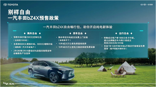 在一汽丰田bZ4X预售期间,用户可享“自由畅行包”超值礼遇。其中,“购车自由”包括预售专享价值2000元定制礼包(全国前1000名)、至高享8000元置换补贴或6000元增购补贴(增购限一汽丰田老客户)、0首付/0息或低息金融方案、全系车型3年内不低于6折保值回购,不仅减轻了用户的购车压力,同时也打消了用户的整车残值焦虑。
