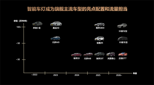 赖岚在演讲中指出,智能车灯已成为新能源旗舰主流车型的亮点配置和流量担当。目前HUAWEI XPIXEL智能车灯模组已搭载至享界S9/ S9T、问界M8/M9、启境GT7、尊界S800等高端车型上。