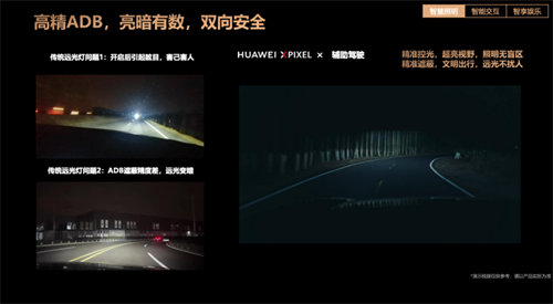 安全是用户出行的基石。夜间行车时,驾驶员视野受限,如果再遇到对向来车开启远光灯,则更难以看清前方路况。针对这一驾驶者的共同困扰,HUAWEI XPIXEL智能车灯模组将华为乾崑智驾ADS的强大感知能力与高精ADB(自适应远光灯)技术相结合,让车灯拥有了“智慧”。简言之,当系统识别到对向车辆或行人时,可在毫秒间自动调整光线,既能为驾驶者保留完整的照明视野,又能精准遮蔽照射到其他车辆或行人的光线,同时还能屏蔽对向车辆的远光灯干扰,极大降低了夜间会车的事故率,让远光灯不再只是“照亮自己”的工具,而成为兼顾双向安全的可靠保障。