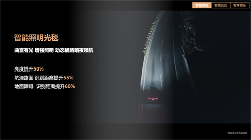 效果也很直观:路面亮度提升了50%,坑洼路面的识别距离增加了55%,地面障碍物的识别距离提升了60%,让用户在黑夜行车时多了一份安全与安心。
