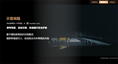 此外,HUAWEI XPIXEL智能车灯模组还可通过车灯清晰传递车辆意图。车辆行经窄路时,其搭载的“示宽光毯”功能会依托华为乾崑智驾ADS实时感知路况,自动在路面上投射出一条与车身等宽的照明光毯,辅助驾驶者提前快速判断能否通行,不用再凭感觉“硬挤”。
